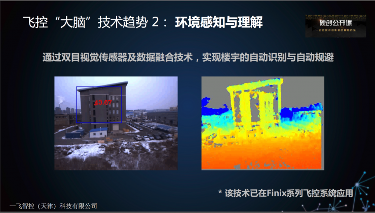 二是对于楼宇这样障碍物的检测与壁碰。其实楼宇障碍物是一种非常典型的障碍物,这里面是通过双目视觉实现对于楼宇障碍物的检测。右边的是双目视觉出来的原始图像,暖色代表离我们近,冷色代表离我们远,基于原始坐标系的深度信息。通过模式识别,通过离线学习、在线计算这种方法,看到左边,我可以把楼的框子识别出来,这样我知道这个楼在我坐标系下每一个点的位置,我可以绕过去。