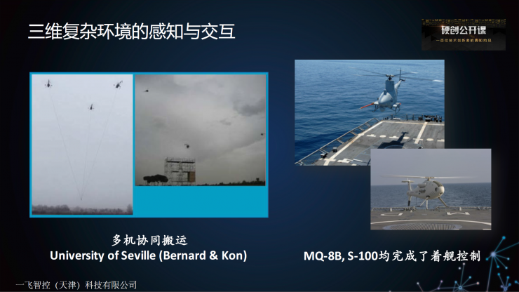 国外还做了很多很有意思的工作,比如左边是西班牙的塞利亚大学做的多机协同的搬运。他们用三个无人机搬运一个非常重的重物,前提是一个无人机搬不起来。这里面有很多科学的问题,三个无人机怎么样去摆渡他们的位置,它们的加速度和速度,才能让三个的力用的最优化,让障碍物不抖起来。右边是国际上已经将这种无人机用在舰船上,扩展舰船的监测范围,美国和奥地利已经有相应的军用产品放在舰船上。