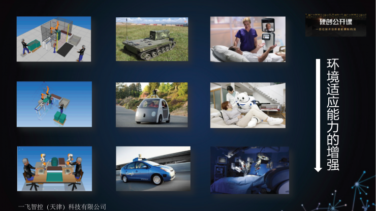 这几类机器人发展的过程,我们可以看出它有一个很有意思的特点,就是它离人越来越近。这个背后有它的技术的发展的脉络,那就是它的环境的适应能力越来越强。因为离人越来越近,要求它的环境的适应能力要非常的强,非常的安全。