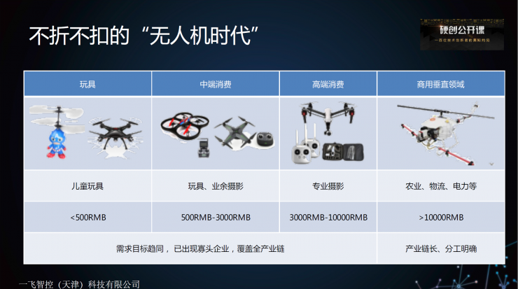 最后一个商业级的垂直领域,它和消费级的完全不同,它的产业链非常的强,而且现在分工非常明确,做部件的,做控制系统的,做机体的,做服务的,做售后的,各司其职来做,就是因为商用领域它的需求完全不同。比如说军用,输电线路巡检,农业喷洒,它的机型、要求、控制、售后完全不同。所以商业应用将会成为一个长的产业链分工明确的产业。