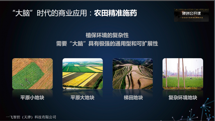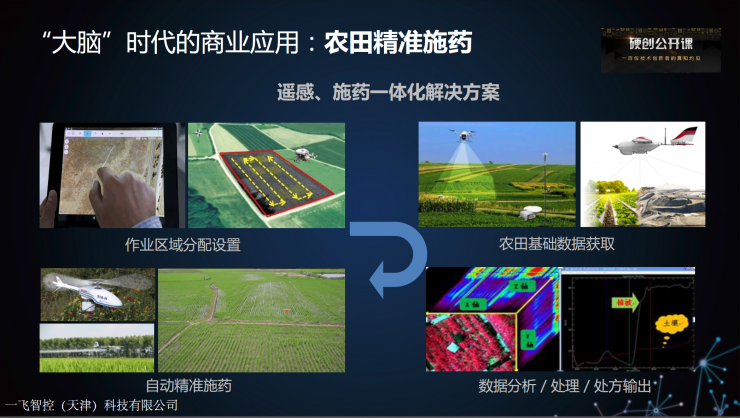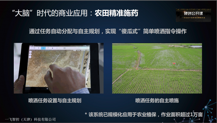 最后着重介绍一个应用,精准的农业。农业在整个应用里是最可能爆发商业化的,因为它的市场容量足够大,确实可以算一回账。就像合作社买联合收割机一样,现在的合作社也在买无人机喷药,从南到北进行喷药作业,让他在一年半左右的时间可以收回成本,其他的都是赚的。