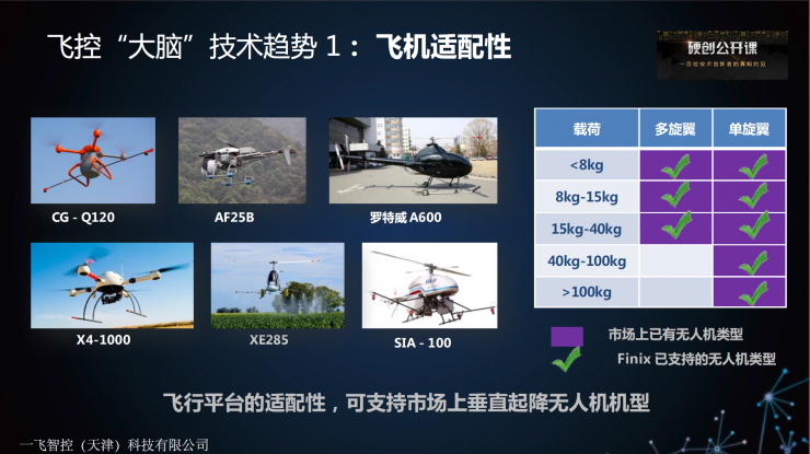 什么叫鲁棒与适配,无人机在商业应用里有一个很大的特点,就是它的机型你会发现非常的不同,商业应用它的不同在于有的应用需要大的载重,有的应用需要长的续航,有的应用需要高的可靠性,有的应用又需要非常不同的能源的模块。这样不同的机型,不同的无人机怎么样用相同的大脑的技术去适配,你是不是有一个控制系统,这些飞机都能够用,这就非常重要。你不可能为每一个机型去单独研发一套感知系统、操作系统和控制系统,所以这就需要研究控制系统的人对飞机进行强的适配。