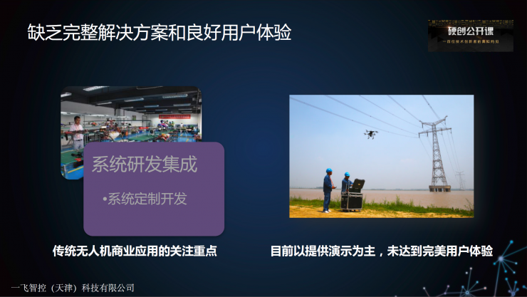 第二方面,其实现在的商用无人机缺乏完整的解决方案,大多数或者说绝大多数无人机的厂商都在做系统的研发工作。无论是无人机展,还是各种创新的展览,很多厂商都是摆着各种各样的飞机,认为飞机就是这个解决方案的核心,其实这是对行业应用或商业应用的误解,更多的商业应用需要的是数据或者完整的解决方案,用户要知道怎么用它,用它干什么,用了能给他带来什么样的效果。所以,现在的很多应用客观的说都是以演示的为主,就像右边那样,飞机飞起来了拍一个照片,就是我们用了无人机在做某某工作。