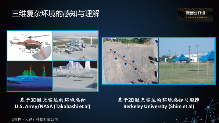 左边的图也是美国的军方和NASA一起做的,通过机关的雷达来对飞机过程的障碍物进行三维的建模,这样可以非常清楚的知道楼的位置在哪儿,怎么绕过这个楼。右边是伯克利大学用2D雷达做的环境的感知和避障,搭了很多账篷,相当于让无人机过桩子,曲线的绕过账篷。这些都是早期的无人机在感知方面的工作。