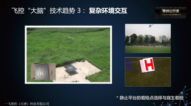 刚才说的其实都是看,什么叫交互,就是飞机不仅仅是悬在空中,还要和我的目标有接触。这个展示的是静态平台着陆的自主的选择与自主的着陆。它是通过视觉来寻找出H的标志点,从空中将无人机导引到H上。这是咱们国家某舰的1:40的缩比的平台,模拟舰船无人机导引下降的过程。