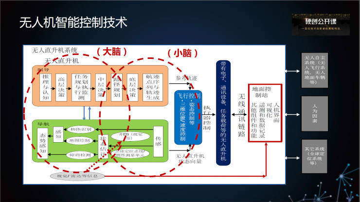 最右边三个灰色的就是一些外部因素对无人机的影响,可能有环境的影响,可能有人的影响,可能有其他载荷系统的影响。这就构成了整个无人机系统。这里面的小脑就是负责无人机稳定的,它可以飞起来,平衡的放在那儿。大脑就是要感知外界的障碍物在哪儿,飞机的故障在哪儿,怎么去避开这个障碍物,怎么去缓解这样的故障,这就是小脑和大脑的区别。