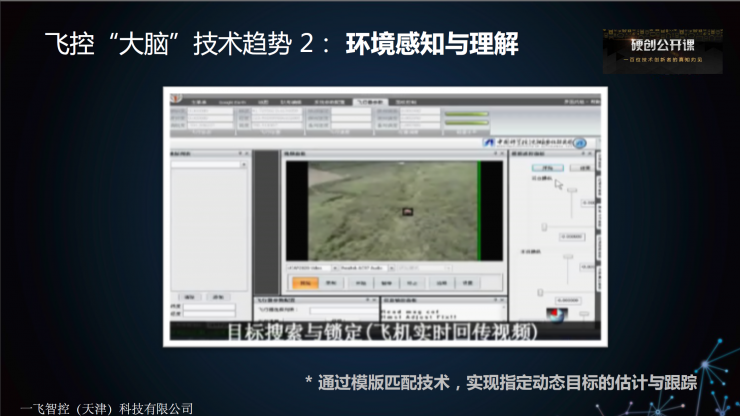 这里介绍的是对于一个动态目标的跟踪,在我们回传的图像里面可以任意设置一个移动的目标,用鼠标点上它以后,飞机可以一直持续的跟住它,保持在飞行的控制范围内,通过模板的匹配对目标进行分离,还需要对目标进行估计,我要估计它下一步的速度和下一步的位置,反过来为无人机进行导航。