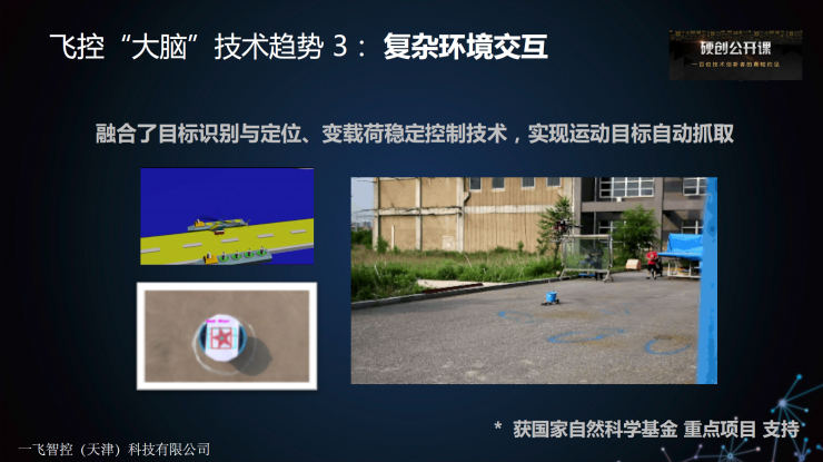 国外近几年将无人机的研究转向了操作方面的研究,这些方面我们也做了很多前沿的布局。这是对一个动态目标的识别与抓取,它的背景是未来物流的一部分,即低成本的运输。比如说在船靠岸之后,从船到陆地之间的运输。除了目标的识别、目标的估计,还有一个很重要的技术,就是变载荷的控制技术。当无人机将目标抓取来以后,它的负载和原来没有负载的时候变化非常的大,在过程中如何能够保证无人机稳定可靠的控制,又成为了一个非常难的难点。载荷基本上相当于无人机一半的重量,这里面又有很多相应的技术。