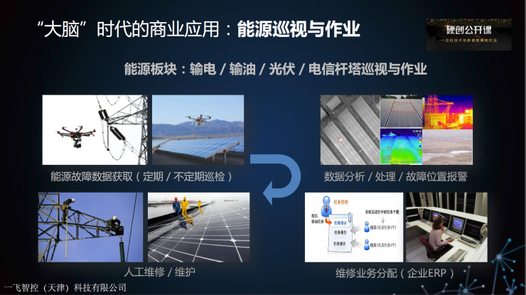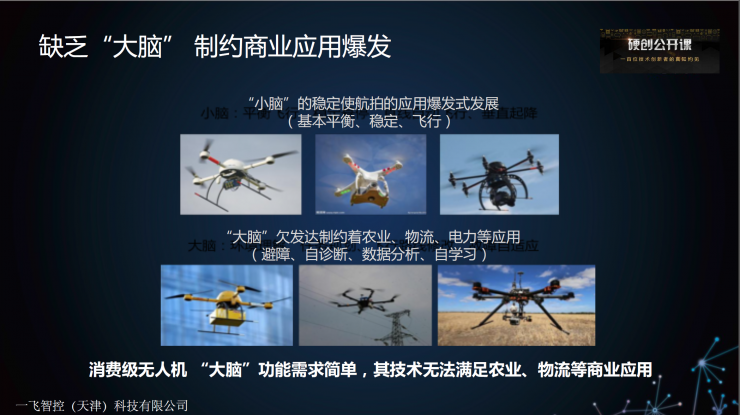 大脑、小脑的概念相信大家多能理解,小脑负责我们基本的稳定,大脑负责我们找回家的路,看看周围是不是有复杂的环境,别撞上。其实无人机或者其他的机器人也是一样,小脑的发达使航拍这样一个应用爆发了,就是因为航拍的需求很单一,飞起来稳定,拿回图像可以了。所以,小脑的爆发大概是在几年前,但是商业应用不同。航拍是我们可以找一个比较空旷的环境去飞,但是商业应用是我指定一个环境你必须去飞,比如输电线路的巡检,比如说快递物流,无论你有什么样的建筑物阻挡,无论什么样的交叉的跨越,你必须要完成这样的任务,这就要求无人机不仅要有小脑,更重要的是要有大脑。它需要感知这样的一个复杂的环境,还需要与环境有更紧密的交互,具备学习能力、数据分析能力。所以这也是现在制约着商用发展的一个重要的原因。