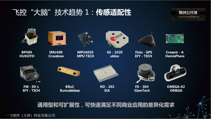 第二方面,对传感器的适配性。不同的商业应用所需要的传感器不同,比如说输电线路的巡检,它需要的是三维的激光雷达。而在一些物流方面,它需要的是双路的视觉来避开复杂的楼宇。如果你有一条总线或者有一条标准的链路,可能不同的传感器都可以接上,这样你就可以非常便利、非常快速的将你的系统适配于不同的应用。这就是鲁棒与适配,希望你的大脑能够适应不同的机型,能够适应不同的传感器。