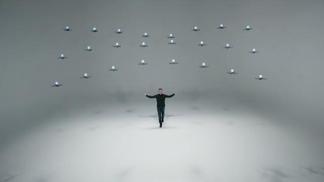 这在天上飞的不是鸟,而是一群无人机。来自纽约的 MagicLab 工作室联合高科技魔术大师 Marco Tempest 为我们带来了华丽的无人机表演。总共 24 台无人机仿若是聪慧的精灵,跟随 Marco 的指挥做出相应的动作,或跳呼啦圈,或围着人旋转,抑或在空中变幻阵列。