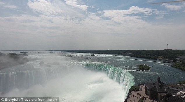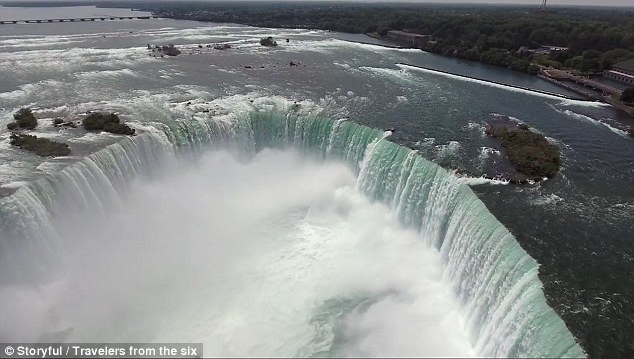 拍摄者在加拿大一侧的草地上对无人机进行操控。他一点也不担心无人机会坠毁,操控着它慢慢地、稳稳地飞到对岸,然后再飞回来。等它安全着陆后,岸上的游客都激动不已。