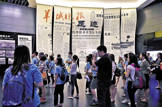 采风团参观最早记录广州开发区奠基的羊城晚报巨大展幕