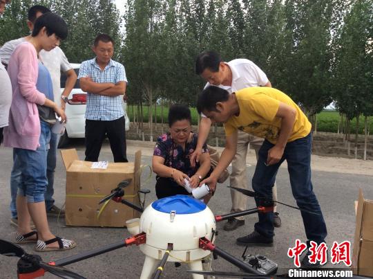 7月5日,张艳璇博士亲自把罐装捕食螨倒进无人机播洒器。 陈国明 摄