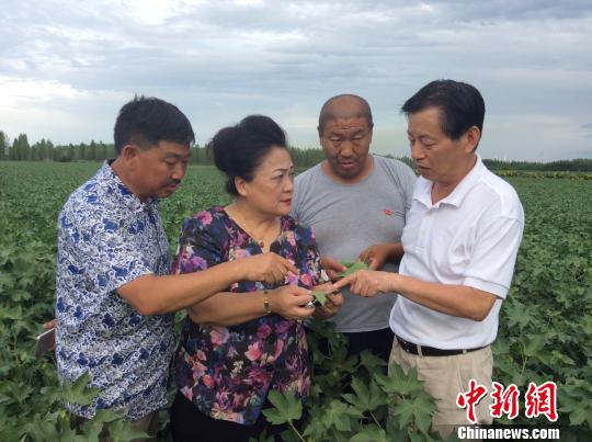 7月5日,张艳璇博士(左二)向潘国华总经理(右)及当地技术人员介绍棉花叶片上的害螨红蜘蛛。 陈国明 摄