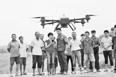 7月5日,在江西宜春高安市豪花村,80后村官方月萍(左五)按下无人机的启动按钮,体验极飞农业提供的飞防服务。 吴俊松摄