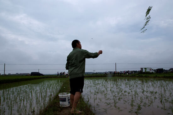62岁的胡师傅无暇顾及村里出现的新事物,自顾自的在地里抛秧。他有四个孩子,都在深圳、杭州等城市工作,由于现在农村“没什么负担了”,他们家只种口感好的“一季晚”,留作自己和孩子们吃的口粮。