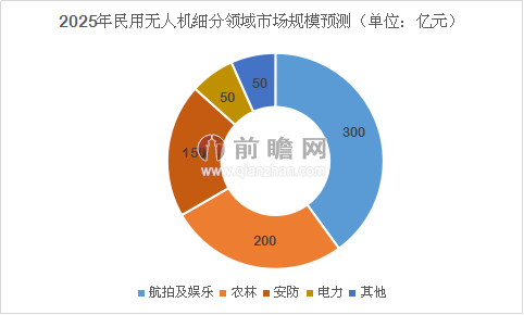 前瞻产业研究院提供的《中国无人机行业市场需求预测及投资战略规划分析报告》报告预计,到2025年,我国民用无人机市场可迅速上升至750亿元人民币,用作航拍与娱乐的消费级无人机将有300亿元市场,在民用无人机市场表现抢眼;其次是农林植保无人机,市场规模为200亿元;安防无人机市场有150亿元,电力和其他无人机则各占50亿元。
