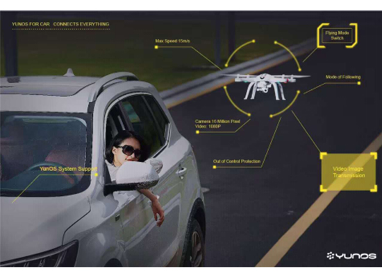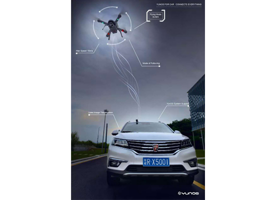 在智能飞控方面,采用自动和手动两种模式,在开车的时候可以打开天窗把一个无人机放出去,无人机以汽车为跟踪目标,实现智能跟拍,将汽车的行驶状态和周边环境实时传输到车内显示屏,利用GPS定位,实现一键起飞、一键降落、自主航线巡航功能等,互联网汽车可通过中控平台触摸屏和方向盘按键进行人工控制,让汽车不再只是一个交通工具,而是改变了新的空间、新的生活方式,互联网汽车成为互联网服务平台,将更多的服务接入进来。同时,互联网汽车还是智能硬件平台,带来更多的想象空间。