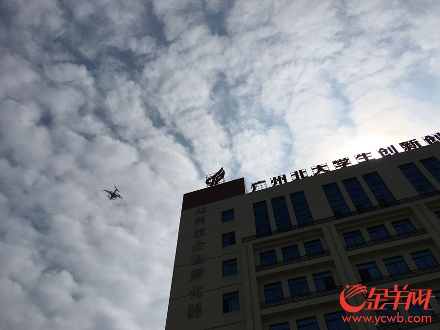在广州北大学生创新创业中心前,大学生创业团队展示其无人机产品。