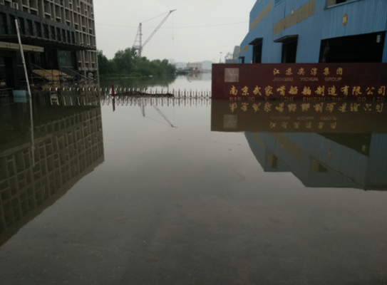 (图为上坝抢险后的堤坝)在完成上坝的拍摄后,小伙子们驱车来到上坝下游的一处防洪点,雨后的道路异常泥泞,轮胎在泥里不停地打滑,车子艰难的行驶到一个路口,在右转的时候,轮胎打滑,车身立刻向右侧的池塘倾斜,动弹不得,好在车后就是指挥部,大家一起协力将车子推了上来。劫后逃生的车子一路颠簸来到了南京武家嘴船舶制造厂。远远地便看见了正在施工的大型船只,走近一看却被这里的情况吓了一跳。整个船厂都淹没在水里,路上停放着解放军的救灾车辆,水位达到了9.78米,据附近的群众介绍,这还是落潮之后水位下降之后的高度。据工作人员透露,这个造船厂虽然建在江边却是建成以来第一次被淹。