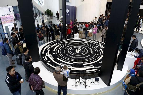 资料图片:2015年12月20日,广东深圳,DJI大疆创新在深圳启动全球首家直营旗舰店,民众在店内观看大疆幻影3无人机的飞行展示。中国在无人机制造方面领先全球,正逐渐成为世界级的无人机技术创新者。