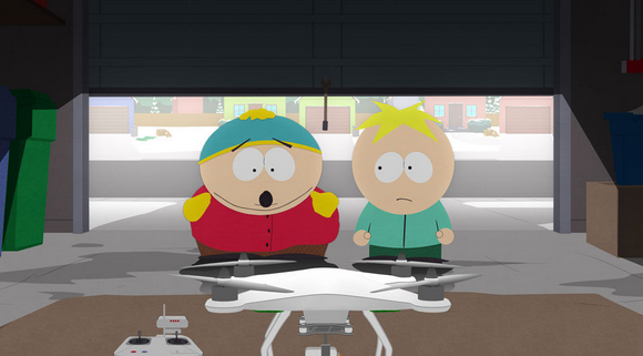 《南方公园》,大疆精灵Phantom 2 Vision+也被植入出镜,Cartman使用他老爸的Specter 2.0(南方公园版DJI Phantom 2)监视邻居。虽然并非实物,但可见无人机在动画喜剧也有不少粉丝。