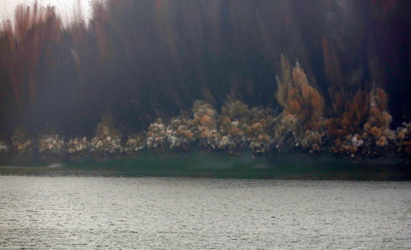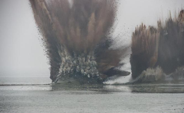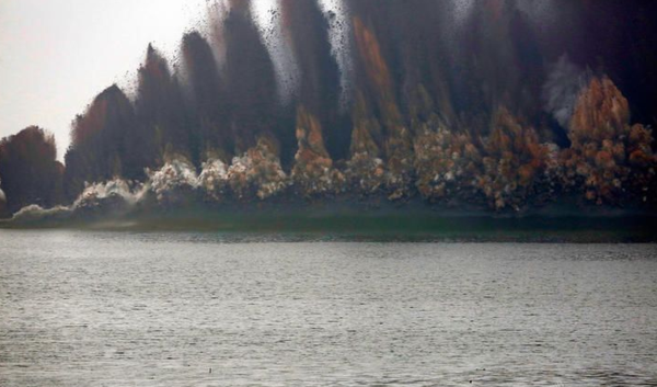 起爆作业现场吸引了不少媒体关注。据了解,有媒体动用无人机航拍起爆画面,中途有数架无人机被爆炸冲击波震落于湖底。