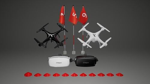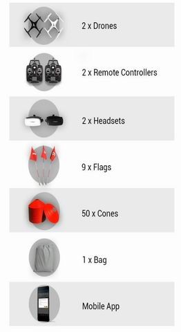 套装里除了一架可以实现第一人称 VR 视角控制模式的无人机外,还有一套用于限制比赛路线的“ 路轨” 以及设置工具,以及用于远程操控的手机 APP。具体包括:两架无人机、两个操控手柄、两个移动端头显、9 面旗子、50 个路障雪糕桶、1 个装袋还有一款智能手机 APP。