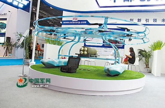 四旋翼无人机在这些年风靡一时,今年的抗洪抢险任务中,部队就使用无人机对灾情进行勘察。展会上,一款长相独特的圆盘型水陆两栖救援无人机引人瞩目。这款无人机外直径3.3米,续航时间50分钟,最大飞行距离20公里,能吊装50公斤的物体。它具有升力大、飞行稳的特点,不但可以利用高精度相机获取空中侦察信息,还可以利用下部类似水上飞机的浮箱,在水面上平稳降落和漂浮,可用于救援时短距离投送物资。除了执行救灾任务外,它还能通过更换任务模块,执行消防和反恐任务。