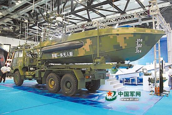 这次展会,还展出了一款车船一体陆军水面无人平台,该平台搭载的无人艇,配合高精度北斗导航系统与船舶自动识别系统,能够自主发现和规避各种障碍物,避免大型船舶和载人救援艇进入危险水域的风险,切实提高救援效率。无人艇采用油电混合动力,满载排水量6000公斤,最高航速27节,续航时间高达6小时。配套的车载控制系统,能够实现无人艇的自动投放和回收。此外,通过配备不同功能的任务模块,还可执行侦察、巡逻、浅海扫雷和通信中继等军事任务。