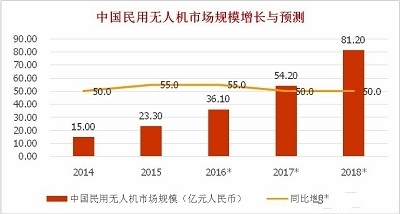 2015年中国大陆无人机市场总规模66.6亿元人民币,同比增长48%,约占全球市场规模的15%。预计2016年仍将保持高速增长,超过96亿人民币,到2018年将超过190亿人民币。