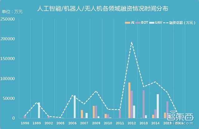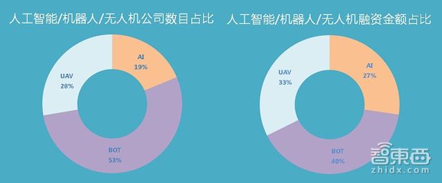 而从各领域融资总额的占比来看,人工智能、机器人和无人机三方则差距不大。机器人依然最多,占比40%,无人机占比33%,人工智能占比27%。