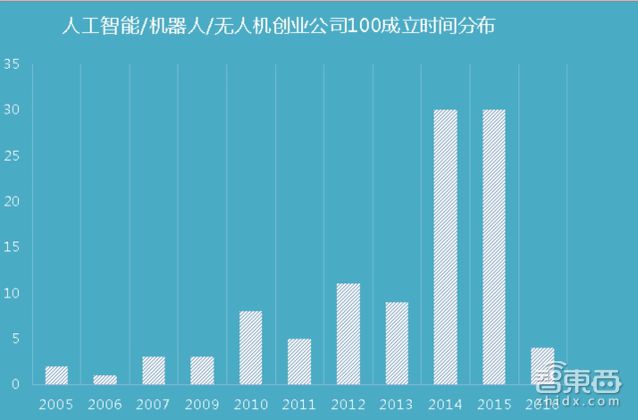 结合第一部分的结论,2014和2015两年,大量人工智能、机器人和无人机领域创业公司开始成立。