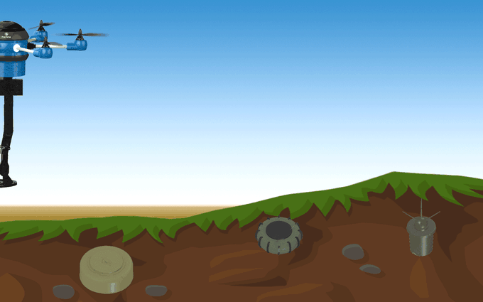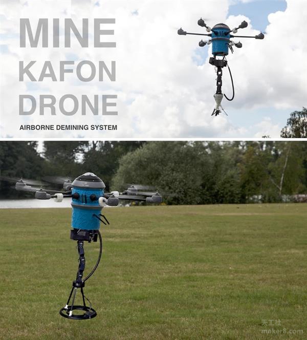 MKD是一种开源3D打印解决方案,它能更容易、更便宜、更安全地清除地雷。它有六个旋转器和三个附属装置。第一个附属装置专门用来对雷区进行绘图。第二个是一个金属探测器,用来探测地雷,探测完成后它会用GPS Maker给地雷做上标记。第三个是一个机器人臂,在地雷被打上标记后它会替换掉金属探测器,从而将乒乓球大小的小型雷管放在地雷的位置上,然后引爆地雷。