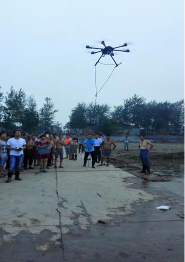由于洪水来势异常凶猛,导致跨河线缆和沿河杆路大量损毁。洪水稍减后,河道内的水流仍然湍急,人员下水施工非常危险,线路跨河布放成为抢险的最大难点。针对此难题,邯郸公司调用旋翼无人机参加抢险,该无人机可在飞行中悬停且载重量适中,飞行距离最大可达800米,非常适合长距离物品传送。操控人员遥控无人机,先将牵引绳调送至河对岸,再将线缆牵引过河,从而完成布放作业。