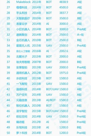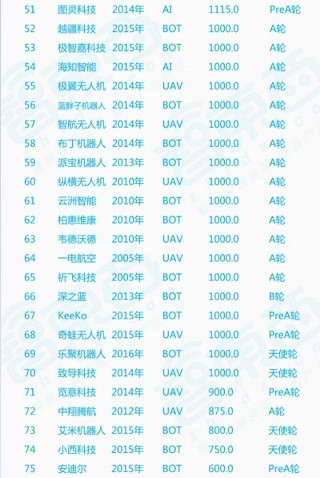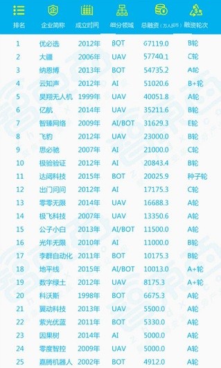 人工智能、机器人和无人机领域创业公司的融资特点是整体数额偏大,尤其在于头部。前11名,融资总额都达到了2亿人民币以上。超过1亿人民币的公司则多达18家。