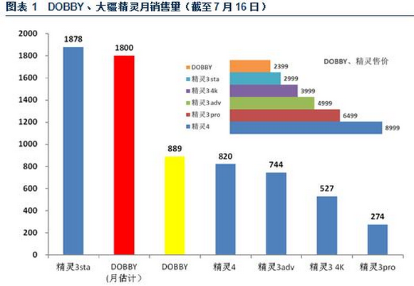 之后的事情,关注无人机行业的朋友应该都有看到,7月5日Dobby众筹结束,总筹资额约1669万RMB。上图为销售量月估计(资料来源:天猫、华创证券),大家可以作为参考。