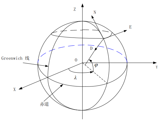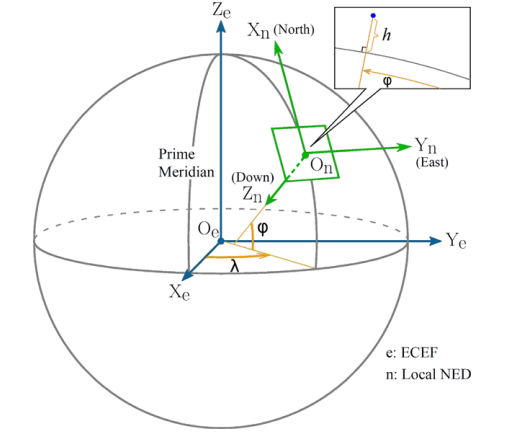 我们通过 G 坐标系下的三个参数:经度,维度,高度,可以获得飞行器在椭球表面的位置坐标。但进行导航计算时,我们需要把数据换算到 NED 坐标系下。要完成从 G 系到 NED 的数据转换还需要一个过渡过程:G 坐标系到 ECEF 坐标系下的数据转换。
