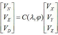 但外环信息一共有六个,还有三个速度状态呢?通过 GPS 可以获得 ECEF 坐标系下的速度向量。与 G 系类似,相比于飞行器在 ECEF 这个三维坐标系的速度向量,我们更关心相对于 NED 坐标系的速度向量: