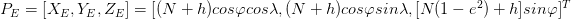 其中 N 是我们常说的曲率半径(m)。通过上面的计算公式就可以实现从 G 坐标系到 ECEF 坐标的数据转换。