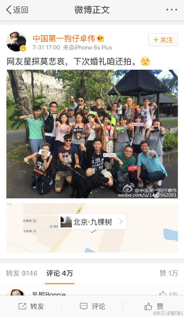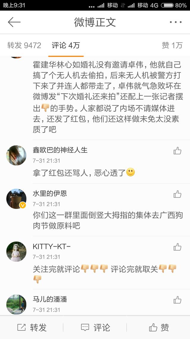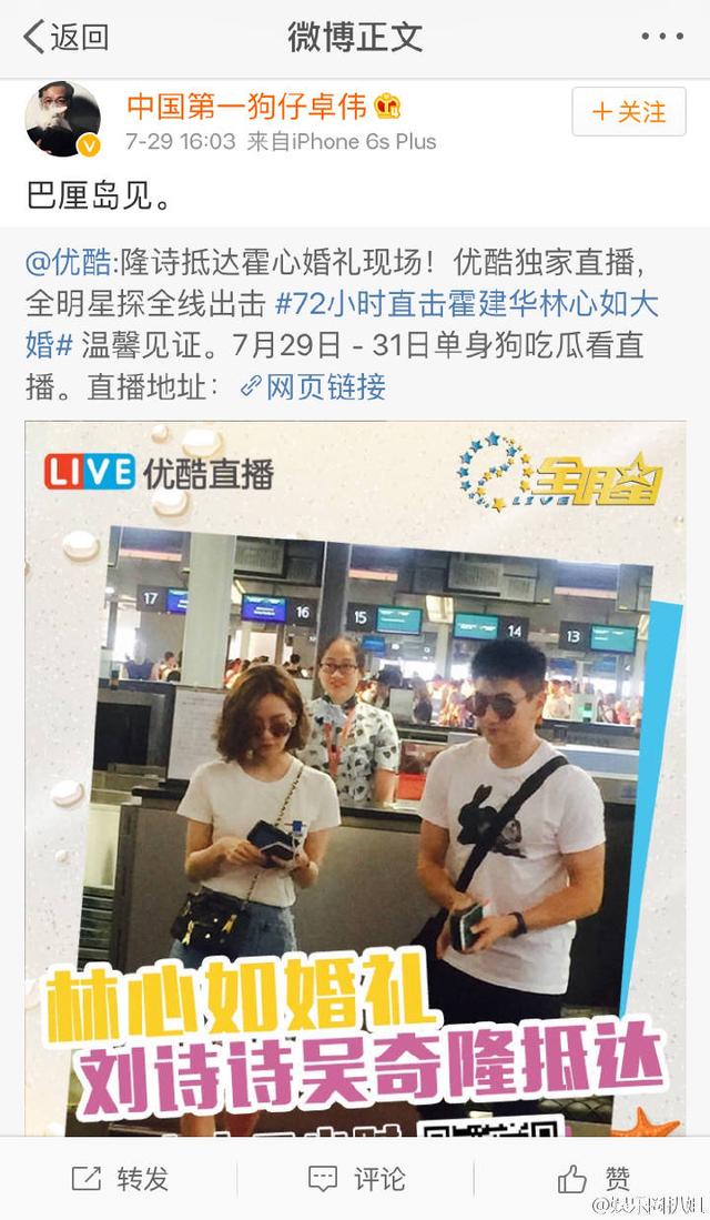 霍建华林心如结婚早就通知媒体不要到场拍摄,并给媒体发了红包。结果卓伟搞个无人机进行航拍,没多久无人机就被警方打下来了,风行的人和无人机都被带走了。卓伟气急败坏发微博称:下次婚礼我再拍!微博的配图里,记者纷纷做“[弱]”手势,但是这张图只是指媒体差劲,和婚礼无关,却因为人家不让拍还诅咒人家有下一次婚礼,真是没素质。