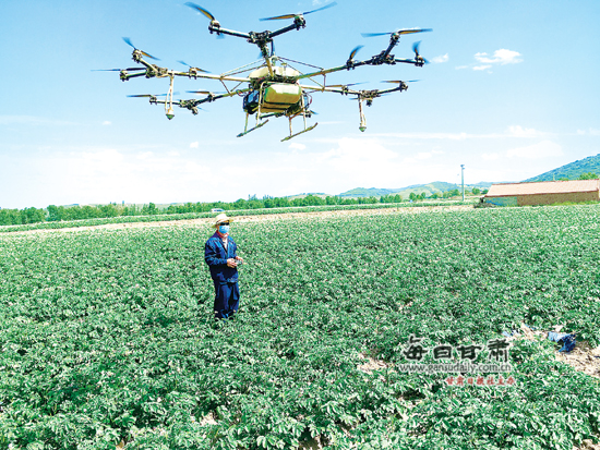 安定区利用无人机以药肥一体化的方式帮助农民打药、施肥。目前无人机服务面积超过10万亩次。