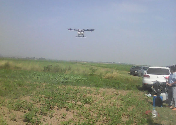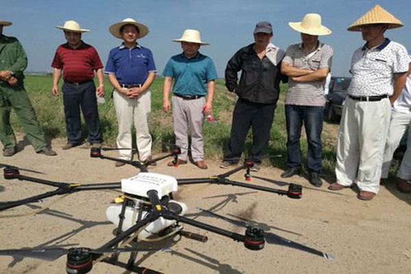 据现场技术人员介绍,这种MG-1农业植保机具有强劲的八轴动力系统,飞行安全性高,每次可以携带10公斤农药,可喷施近1公顷田地,其每小时作业量可达3至4公顷,作业效率是人工喷洒的40倍以上。无人机支持自动作业,可实现定速、定高飞行和定流量喷洒。另外无人机支持航线断点智能记忆功能,无药时自动记忆坐标点,添加药剂后可一键返回到记忆点继续喷洒作业,确保作业的连续性。