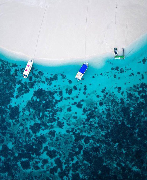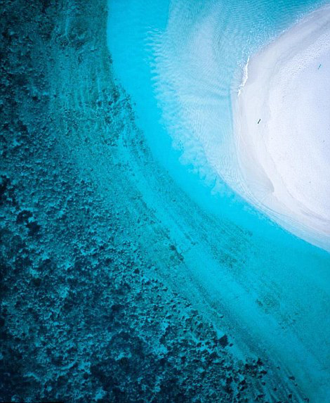 照片美得令人窒息。海水颜色变化多端,从浅蓝到深蓝、从碧绿到粉红;岸边各色悬崖,有橘的、蓝的、黑的,与海水形成鲜明对比;细长的沙滩宛如一条银丝带镶嵌着海岸,时有澎湃的海浪拍击怪石嶙峋的海礁,还有快艇游过带出一条优美的白线。透过照片仿佛可以闻到清新的海水味。