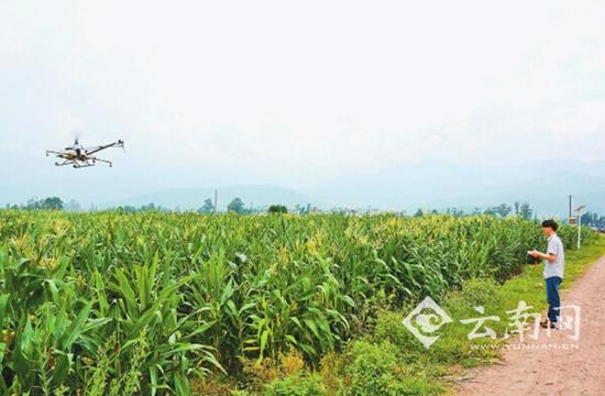 8月5日,在巍山彝族回族自治县庙街镇盟石村,该县蓝图农机专业合作社技术人员操作无人机,帮助农民进行玉米病虫害防治。