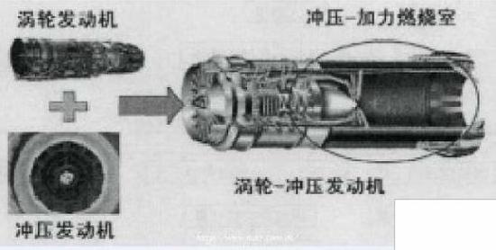 涡轮/冲压组合发动机是将涡轮发动机和冲压发动机组合起来使用的吸气式发动机。根据涡轮发动机和冲压发动机的组合方式,可以分为分体式和整体式组合发动机, ,其中整体式组合发动机又根据涡轮和冲压两类发动机主要部件的关系和流程分为串联布局和并联布局。在涡轮/冲压组合发动机中,冲压发动机按其工作模态分为亚燃、超燃和双燃冲压发动机。亚燃冲压发动机采用超声速进气道, 燃烧室入口为亚声速气流, 推进速度可达6倍声速;超燃冲压发动机在马赫4~4.5开始投入运行,飞行速度马赫16,理论上可以达到马赫25左右;而在双燃冲压发动机中,实现了亚燃和超燃两种工作模态有机结合,其运行限速约为马赫3,最大飞行速度约为马赫6.5。早前时间曝光的我国高超音速无人飞行器试飞成功可能就是用的这类组合发动机。