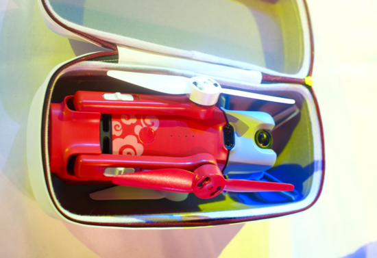 跟手机对比:可以看出相比于零度DOBBY,此款无人机就体积来说还是要大许多,主体增加的应该是电池部分,所以,在续航上希望能有突破。此外厂家很贴心的配备了一个类似女生的化妆包,出行的时候放在背包里还是可行的。