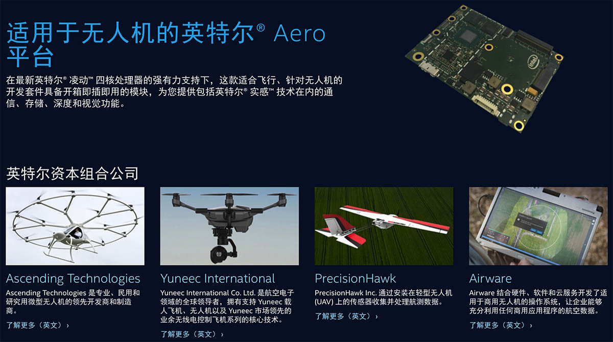 从 AirMap 就可以看到,英特尔的 Aero 无人机强大之处,就是他们透过这几年内来产业内的布局,提供庞大的生态链,吸引开发者支持英特尔。我们在英特尔的网站里(下图),除了找到 AirMap 之外,他们也收揽了著名飞控开发商 Ascending Technologies、航空传感器数据处理公司 PrecisionHawk、商用无人机操作系统开发商 Airware 等。