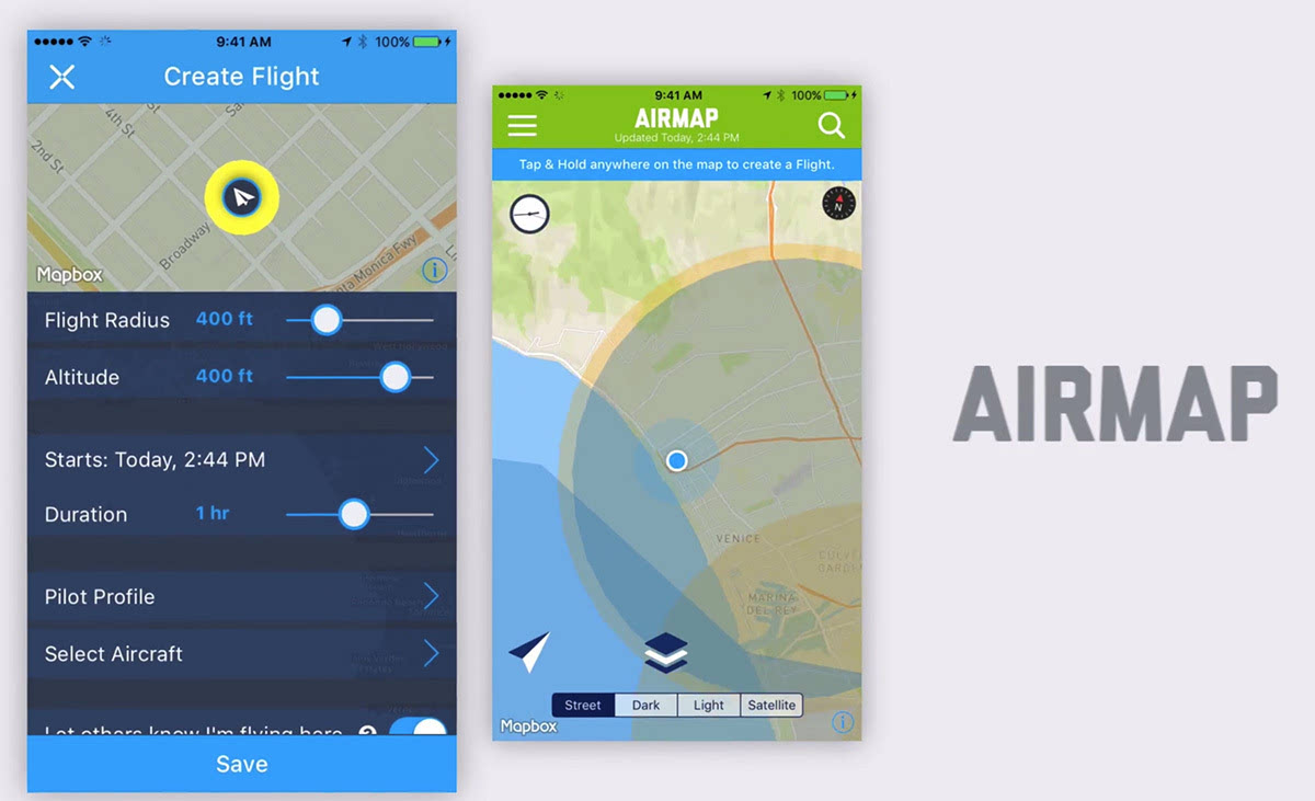 根据 Techcrunch 的说法,AirMap 本身是大疆及 3D Robotics 的合作伙伴,能实时反馈无人机使用的低空区域信息,包括飞手、应用开发者,以致机场和监管机构(下图)。